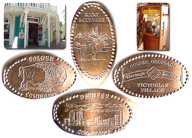 Designs: 1) Rocky Mountains, mountains & elk, Colorado; 2) Golden, bison, Colorado; 3) Denver, mountains & outline of Denver skyline, Colorado; and 4) Golden Colorado, Heritage Square, Victorian Village.