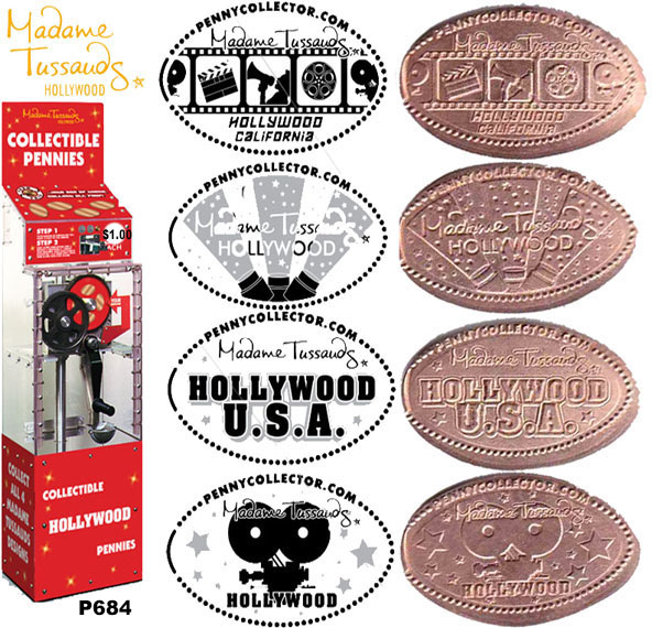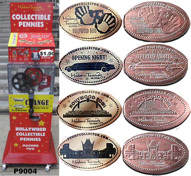 Machine 1 is in front of the entrance to the Wax Museum. Designs all have a beaded border with 'pennycollector.com Madame Tussauds Hollywood':