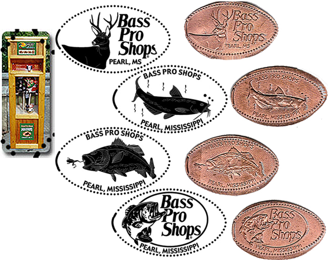 Machine upstairs aside of shooting arcade. Go to the left once you get upstairs by the elevator or stairs. There's a change machine next to the penny press but it's been out of order for the last three or more years. Machine is .51 cents and you use your own coin. All have Bass Pro Shops Pearl, Mississippi' on them. Designs are: