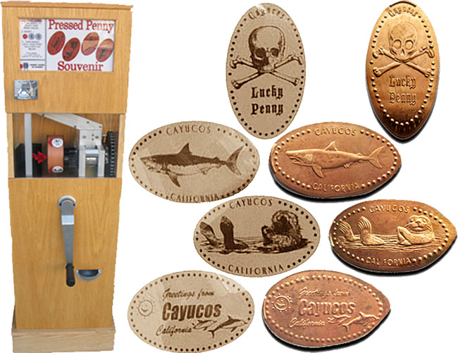 Machine 1 (Placed 8/2010) is outside by the front door on nice days and inside the front entrance to the right on bad weather days. Cost to press: 51¢ each design. Designs all have a beaded border with 'Cayucos':