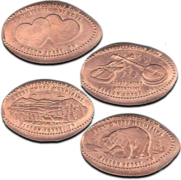 1. Horizontal penny with bear design, Great Smoky Mountains above bear and Pigeon Forge, TN below bear